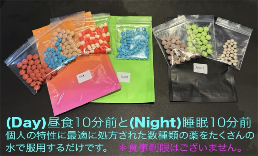 (1クール/4週間分です。昼食前、睡眠前各10分に指定の数種類のお薬を同時服用となります。)
